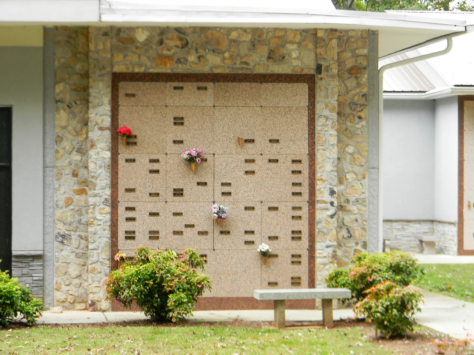 The Catholic cemetery does not require specific rituals, but offers a variety of options – small mausoleums, private estates with stacked stones, photos on gravestones, etc.  Known as the “Garden of St. Matthew,” the Catholic section has columbarium units (buildings with niches in it) to house cremated remains as well as in-ground burials of cremated remains.  Visitors can leave specialty silk flowers in the vases on or near the stones indefinitely or place fresh flower arrangements for up to 10 days after the memorial service.
