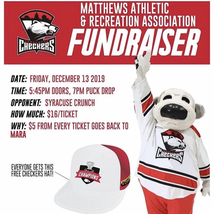 One Fun Thing: Attend the Checkers game this Friday and $5 from your ticket purchase for seats in Section 106 will go back to Matthews Athletic Recreation Association (MARA). Purchase tickets online.